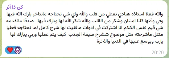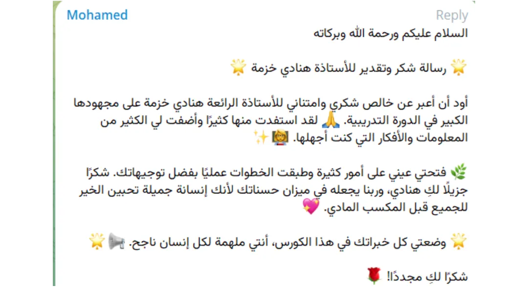 رغم أنني ما زلت في بداية مشواري، إلا أنني أشعر بالثقة والحماس للاستمرار في التدريب معها، لما لمسته من جدية، التزام، واهتمام حقيقي بنجاح المتدربين.